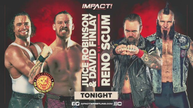 FinJuice is announced as representing NJPW. Finlay and Luster start the match, but Finlay and Juice quickly tag each other in and out of the ring, hitting double team moves on Luster as Juice gets a 1 count. Finlay comes in but runs into a spinebuster from Luster as he tags Thornstowe in. Thornstowe hits a dropkick and knocks Juice off the apron. Luster comes back in and hammers Finlay in the corner before tagging Thornstowe back in. They double team Finlay, before the hot tags Juice in who takes out both of Reno Scum. Juice hits Luster with a bunch of right jabs followed by a left hand. Juice clotheslines Thornstowe in the corner and hits him with a cannonball for a 2 count. Reno Scum double team Juice until Finlay comes in for the save as they knock Luster outside. Finlay hits a Superplex on Thornstowe followed by a frog splash by Juice for the pin.