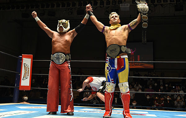 The duo of Tiger Mask and current IWGP Junior Heavyweight Champion Robbie Eagles defeated Yoshinobu Kanemaru and El Desperado for the titles.