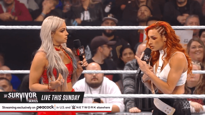Ahead of her singles match against Charlotte Flair at Survivor Series, Becky Lynch addressed her opponent and while doing so, Liv Morgan, new number one contender to the Raw Women’s Title appeared. Their segment concluded with Lynch attempting to hit the ‘Man Handle Slam’ on Morgan but Morgan countered out of it.