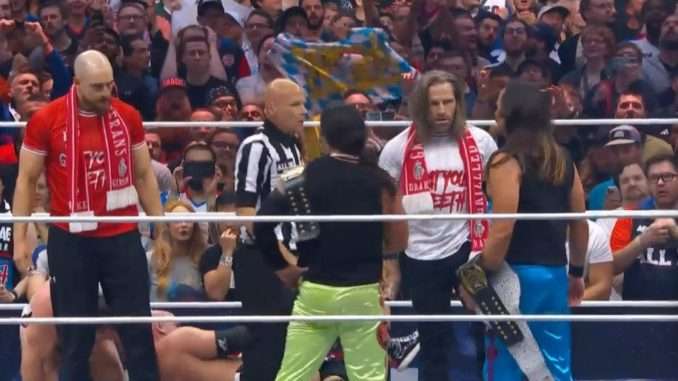 The AEW World Tag Team Championships were on the line at All In in a three-way tag bout. Going into the match as the champions were The Young Bucks (Matthew Jackson & Nicholas Jackson) and the challengers were FTR (Dax Harwood & Cash Wheeler) and The Acclaimed (Max Caster & Anthony Bowens).