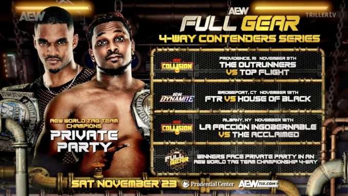 A Tag Team Contender series was announced on Saturday’s episode of AEW Collision to determine three teams that will face Private Party at Full Gear.