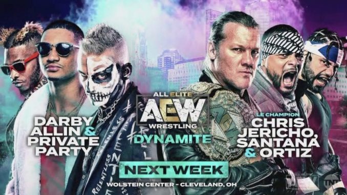Next week’s episode of All Elite Wrestling: Dynamite is taking place from the Wolstein Center in Cleveland, Ohio and on tap for the show is a six-man tag team match that will pit Darby Allin and Private Party (Marq Quen & Isiah Kassidy) against The Inner Circle (Santana, Ortiz & AEW World Champion Chris Jericho). Jericho, Santana and Ortiz were victorious on the Jericho cruise edition of Dynamite on-which they defeated Jungle Boy, Luchasaurus and Marko Stunt.