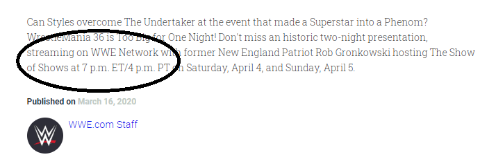 **WWE has yet to comment on the status of whether WrestleMania is being taped next week, which we have inquired about. However, POST Wrestling learned on Friday that a message has been circulated within the company regarding how to promote WrestleMania on the WWE Network. It is being said to avoid tag lines such as “streaming live” and/or “live on WWE Network” and instead to promote the show as “Too Big for One Night”. This is not confirmation that WrestleMania is being taped but it is notable that they were omitting the term “live”. There is a preview of The Undertaker vs. AJ Styles on the website that has also been changed from “streaming live” to “streaming” when promoting the WrestleMania broadcast.