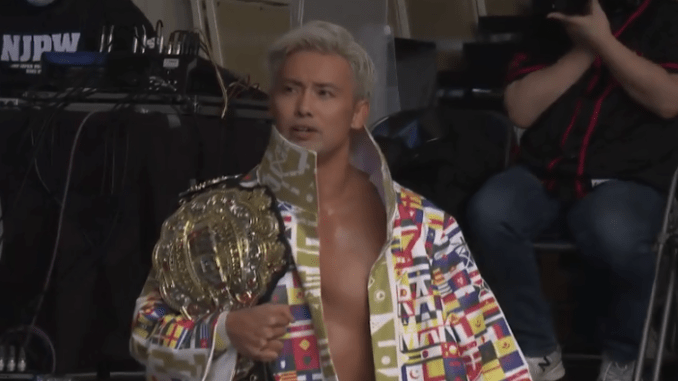 Okada walked out with the retired championship over his shoulder for his six-man tag match against the Guerrillas of Destiny & Jado.