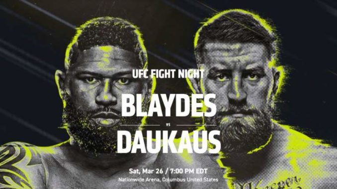 In the opening minute of the second round, Blaydes landed a counter right hand that dropped Daukaus hard, and he swarmed him with ground and pound strikes until the fight was stopped.