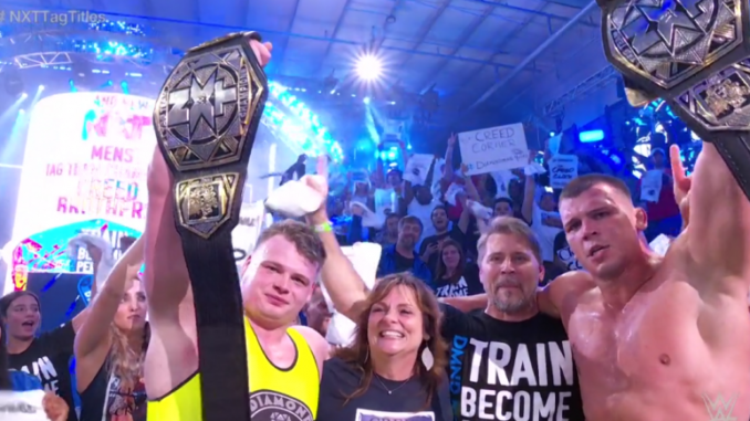 Julius: It’s kind of been an organic thing, you know? We don’t have the second generation blood, people aren’t behind us because of someone else that came before us. I think we’re paving the way for future generations and that’s something a lot of people can resonate with. We weren’t given anything, we’ve had to earn it for ourselves and I think the fans can resonate with that. Everyone out there scratching and clawing and fighting and just trying to provide a better way for their loved ones and that’s the goal here. That’s why we show up and we work as hard as we do, that’s why we believe we’re the best and that moment at NXT In Your House was kind of just the culmination of some of that work finally getting to come to fruition. Like Brutus said, growing up, we lived a super busy life. I look back at the life that my parents lived and I don’t know how they did it. I have so much respect for it. My mom’s up at 5 o’clock, she’s going to work, making sure we’re getting off to school. My dad’s already at work at that point. They’re working all day long. My mom’s coming straight from work to pick us up from a practice to take us to another one, to take us to another one. Then cooking for us, putting us to bed, waking up and doing it the next day. The time that we spent together was on the way to workouts, on the way to wrestling practices, in the car playing with WWE action figures, watching WWE so to have them down here — and my dad was a huge WWE fan growing up — to get to have them down here and kind of all that symbolic and memorable experiences come full circle was a great moment but I can tell you, as Brutus told me he loved me standing there next to the barricade, I was telling him, ‘It’s just a step in the journey to get to the destination because as sweet as it is, I don’t want it to end’ and you know, I think there’s bigger things for us to come. It made us hungrier so hopefully, it’s just the first taste of success that we have here in WWE as well as the first taste of getting a title in this company.