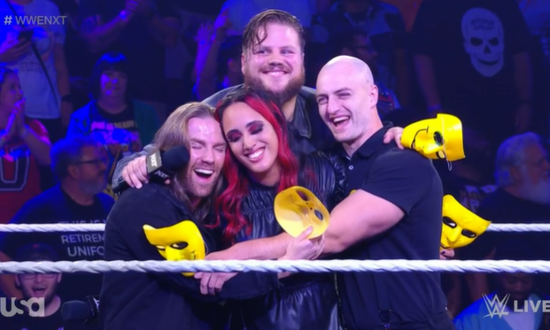 For weeks on NXT programming, an individual in a red hoodie had been seen with The Schism (Joe Gacy, Rip Fowler & Jagger Reid). On tonight’s NXT TV, that individual revealed their identity.