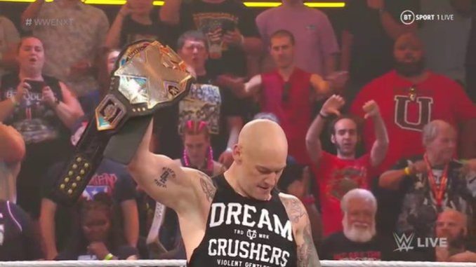 As Carmelo was celebrating his win, he was taken out by Baron Corbin. Corbin laid out Hayes and held up the NXT Championship.