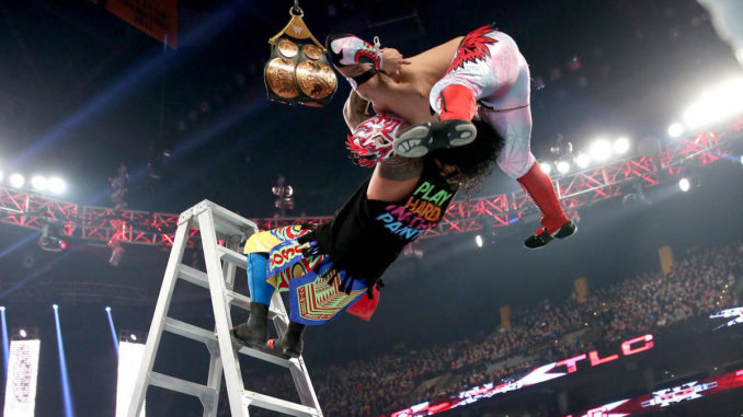 Opening up WWE’s 2015 TLC pay-per-view was a Triple Threat Tag Team Ladder match for the Tag Team Championships. New Day’s Big E and Kofi Kingston successfully defended against The Usos (Jimmy & Jey Uso) and the duo of Sin Cara and Samuray Del Sol a.k.a. Kalisto.