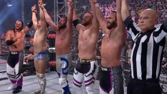 Getting their hands raised at the conclusion of AEW Blood & Guts 2023 was The Golden Elite (Kenny Omega, Kota Ibushi, Matt Jackson, Nick Jackson & Hangman Adam Page). They bested the team of PAC, Konosuke Takeshita and Blackpool Combat Club (Jon Moxley, Claudio Castagnoli & Wheeler Yuta). PAC and Takeshita walked out on their team.