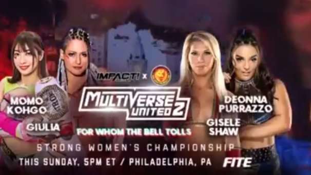 At the start of the 8/17 IMPACT Wrestling on AXS, Deonna Purrazzo went one-on-one with KiLynn King. A lower third was shown to confirm the NJPW STRONG Women’s Championship match for IMPACT x NJPW Multiverse United 2.