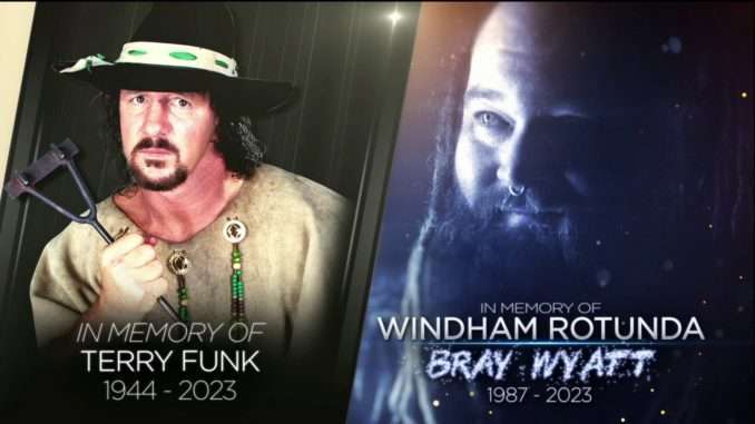 SmackDown started with a double “In Memory” card in tribute to Terry Funk and Bray Wyatt. We then cut to the arena and the roster was gathered on the stage including Erick Rowan. Michael Cole announced that tonight they would be honoring their legacies and then they did the traditional ten-bell salute.