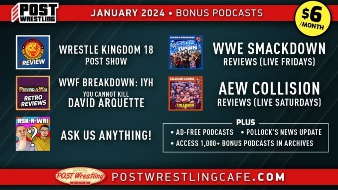 Support POST by jumping on board at POSTWrestlingCafe.com as $6 per month gains access to all our bonus shows, plus archives including 146 editions of Rewind-A-Wai (full list of shows covered).
