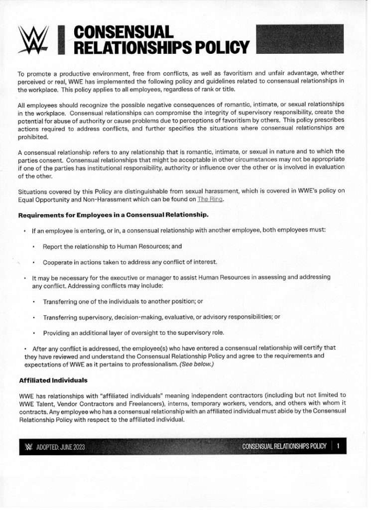 Along those lines, WWE’s current policy includes a “Consensual Relationship Acknowledgement” form.