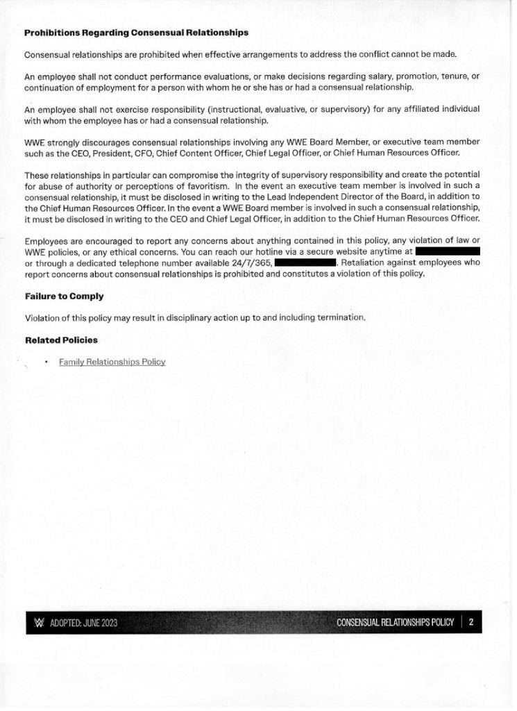 “WWE strongly discourages consensual relationships involving any WWE Board Member, or executive team member, such as the CEO, President, CFO, Chief Content Officer, Chief Legal Officer, or Chief Human Resources Officer.”