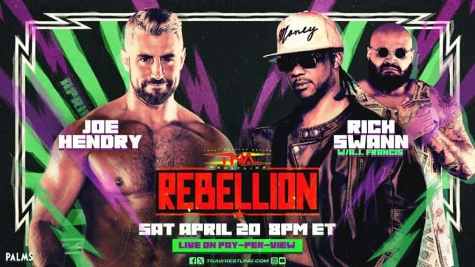 TNA then rolled out the announcement that Swann will be taking on Hendry at Rebellion on 4/20. On the 3/13 edition of TNA iMPACT, Swann and Francis unveiled their alliance when Swann assisted Francis in defeating Hendry.