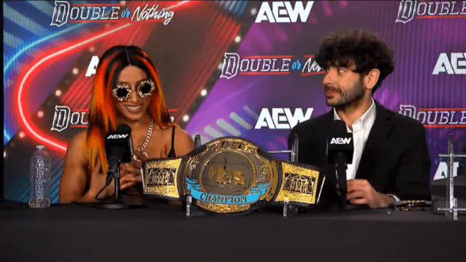 Taking the stage at the post-Double or Nothing press conference was newly crowned TBS Champion Mercedes Moné. She joined AEW President Tony Khan and NJPW President Hiroshi Tanahashi on stage.