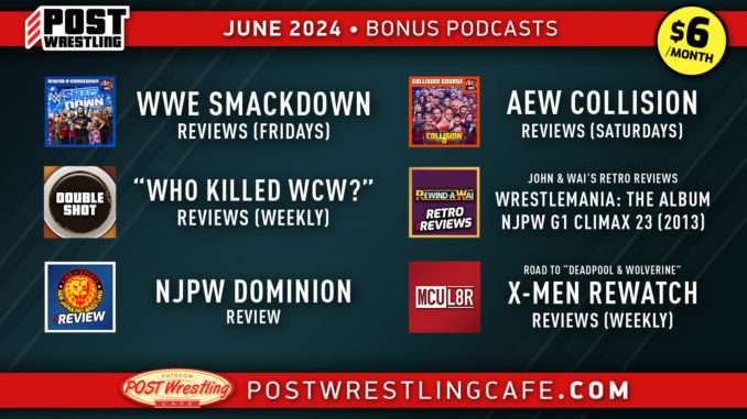 Join the POST Wrestling Café for $6 per month with access to all of these bonus shows along with weekly editions of Rewind-A-SmackDown on Friday, and a review of NJPW Dominion this Sunday with Karen Peterson & Bruce Lord.