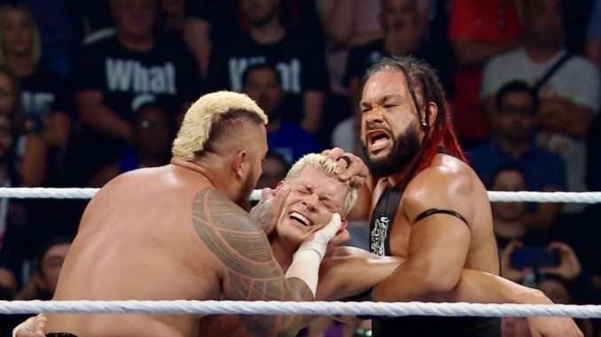 Back in the ring, the heels got the upper hand, mostly courtesy of Jacob Fatu. This included Fatu holding Rhodes for the Samoan Spike from Sikoa.