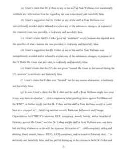 Colker and Peak Wellness explicitly deny withholding any information regarding her care, never refused or avoided explaining any of the treatments Grant received, never gave Grant any “pushback” when Grant inquired as to the specifics of what vitamins she was provided, denied claims of Grant stating she felt “unwell” during I.V. sessions, and that Colker ever “berated” Grant is “recklessly and harmfully false.”