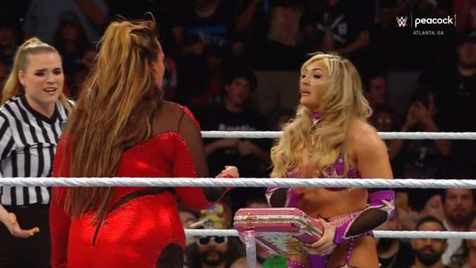 Nia Jax retained her WWE Women’s Championship over Bayley. During the match, Ms. Money in the Bank Tiffany Stratton appeared and was going to cash-in while Jax and Bayley were down. Jax rose up, and a frightened Stratton began to swear to Jax that she was not planning to cash-in. Stratton tossed her briefcase at Bayley while she was on the top rope which distracted her and led to Jax retaining.