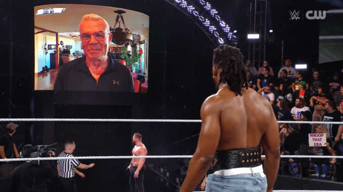 As he was doing so, Holland made his way out to the ring. While the two were going back-and-forth, Eric Bischoff appeared via video.