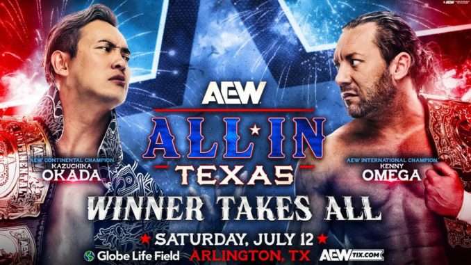 Kenny Omega and Kazuchika Okada will meet at the Globe Life Field on July 12, the promotion announced during Fyter Fest on Wednesday night. The match has a “Winner Takes All” stipulation, meaning that it’s for both Okada’s AEW Continental Championship and Omega’s AEW International Championship.
