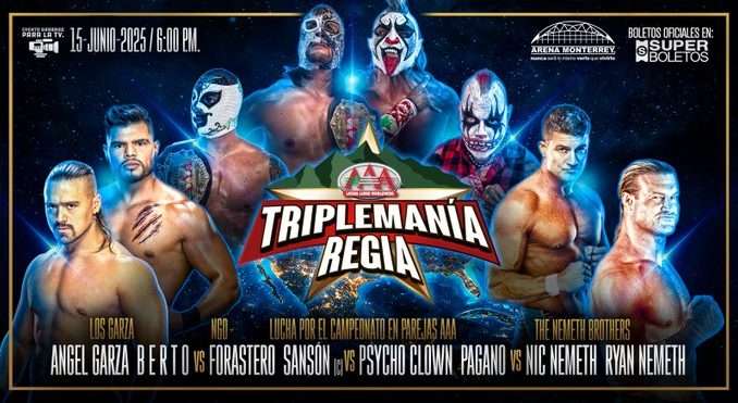 Nos espera una impresionante contienda por los Campeonatos en Parejas en #TriplemaniaRegia.@AngelGarzaWwe y @humberto_wwe vs @NgdSanson y @forasteroNGD vs @Psychooriginal y @Pagano656 vs @ryrynemnem y @NicTNemeth.