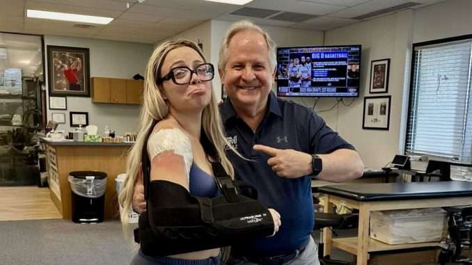 The image shows Morgan wearing a sling with her shoulder heavily taped.