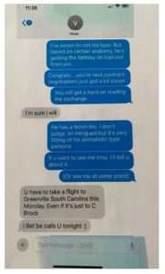 235. McMahon actively attempted to organize a sexual encounter between Ms. Grant and Lesnar, stating: “U have to take a flight to Greenville South Carolina this Monday. Even if it’s just to C Brock”.