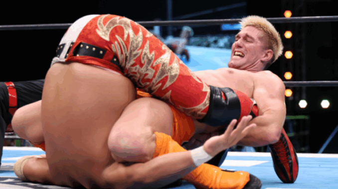 The House of Torture presentation was in full force when Ren Narita submitted Great O-Khan to stay on top of the block. Narita attacked O-Khan’s knee throughout the match after Yoshinobu Kanemaru struck his knee with a whiskey bottle. Narita grabbed the push-up bar, and O-Khan had back-up with Jakob Austin Young getting involved, including ringing the bell as Narita relinquished a kneebar in a role reversal. It ended after Narita spat whiskey in O-Khan’s face, hit the Double Cross, and used an Inverted Figure-Four to force the submission.