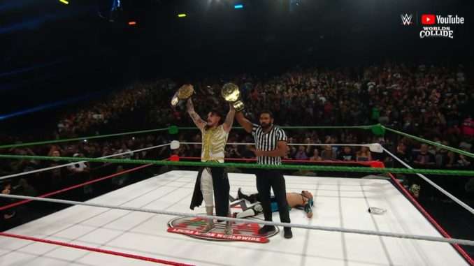 Lee caught McDonagh with a Mexican Destroyer. Page landed a cutter to Lee, but the follow-up pin attempt was broken by Wagner Jr., who came off the top with a Swanton Bomb onto them. Wagner Jr. scored a Wagner Driver onto McDonagh, hitting Page out of the ring in the process, paving the way to a clean pinfall victory to retain his title in just under 10 minutes.