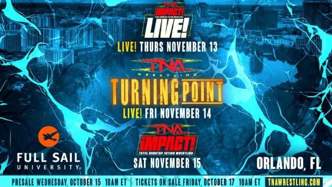 November 13 will see TNA present a live episode of Impact from the former NXT TV grounds. One night later, they’ll head back to the venue for Turning Point. Then, on Saturday, they’ll visit the final for a third time, taping future weeks of TV at the venue.