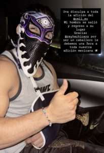 Apologies to all the @cmll_mx fans. My shoulder popped out and then went back into place. Thank you, @reyhechicero, for being a gentleman; we owe our Mexican fans a third one.
