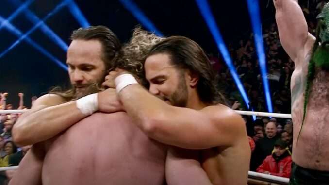 Once the dust settled, Jurassic Express checked on Omega before shaking hands with the Bucks. When Omega rose to his feet, Matt and Nick offered him a handshake. Omega slapped their hands away and instead embraced his longtime friends, signaling a full reunion as the crowd chanted “Hug It Out.”