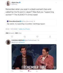 In Kay’s response, she wrote: “Remember when you spat in a black woman’s face and called her the N-word in Japan? Was that you “supporting women”? The AUDACITY of this tweet”