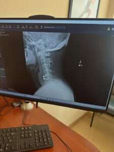 One image displayed an X-ray that appears to show a fusion of the upper vertebrae. Taylor included a joking caption reading, “Got my neck cut off.”