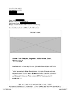 Three days later, on Aug. 25, Christopher Donini, a managing director at Raine, emailed materials to Lublin and Schleimer — the same Endeavor executives Shapiro texted a month earlier about McMahon’s eventual return. Donini copied Sine. The message referenced a prior conversation with Sine and attached what Donini described as “high level overview materials” and “sensitivities” related to “Project Stunner,” Raine’s apparent internal code name for the WWE transaction. Donini offered to schedule a call to discuss the materials.