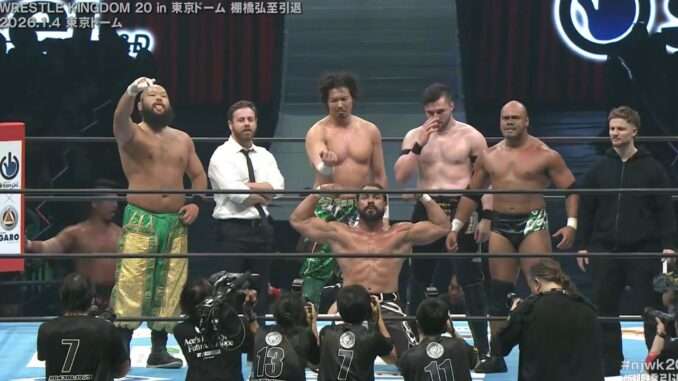 The team of Jake Lee, Andrade El Idolo, HENARE, Callum Newman and Great-O-Khan defeated the squad of David Finlay, Drilla Moloney, Gabe Kidd, Hiromu Takahashi and Shingo Takagi on Sunday night as part of NJPW’s Wrestle Kingdom 20 card in the Tokyo Dome.