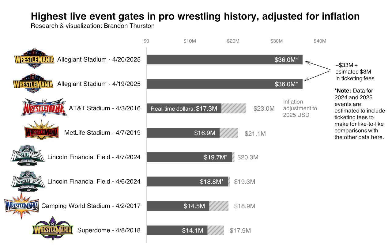 Until WrestleMania 41 in Las Vegas, Night 2 of WrestleMania 40 in Philadelphia stood as the highest gate in pro wrestling history in terms of real-time dollars. Adjusting for inflation, WrestleMania 32 in 2016 in Arlington, Texas, was the previous recordholder, with its $17.3 million gate equal to about $23 million today. Each night in Las Vegas last year surged past that number by about $10 million.