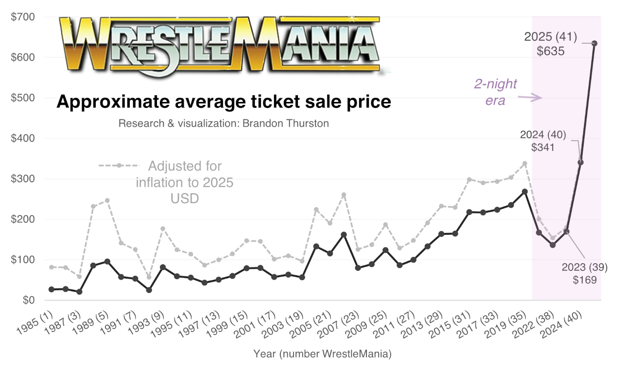 The average ticket sale for WrestleMania last year was about $635, nearly doubling the Philadelphia WrestleMania, the latter of which itself roughly doubled the WrestleMania before that in 2023 in Inglewood, California.