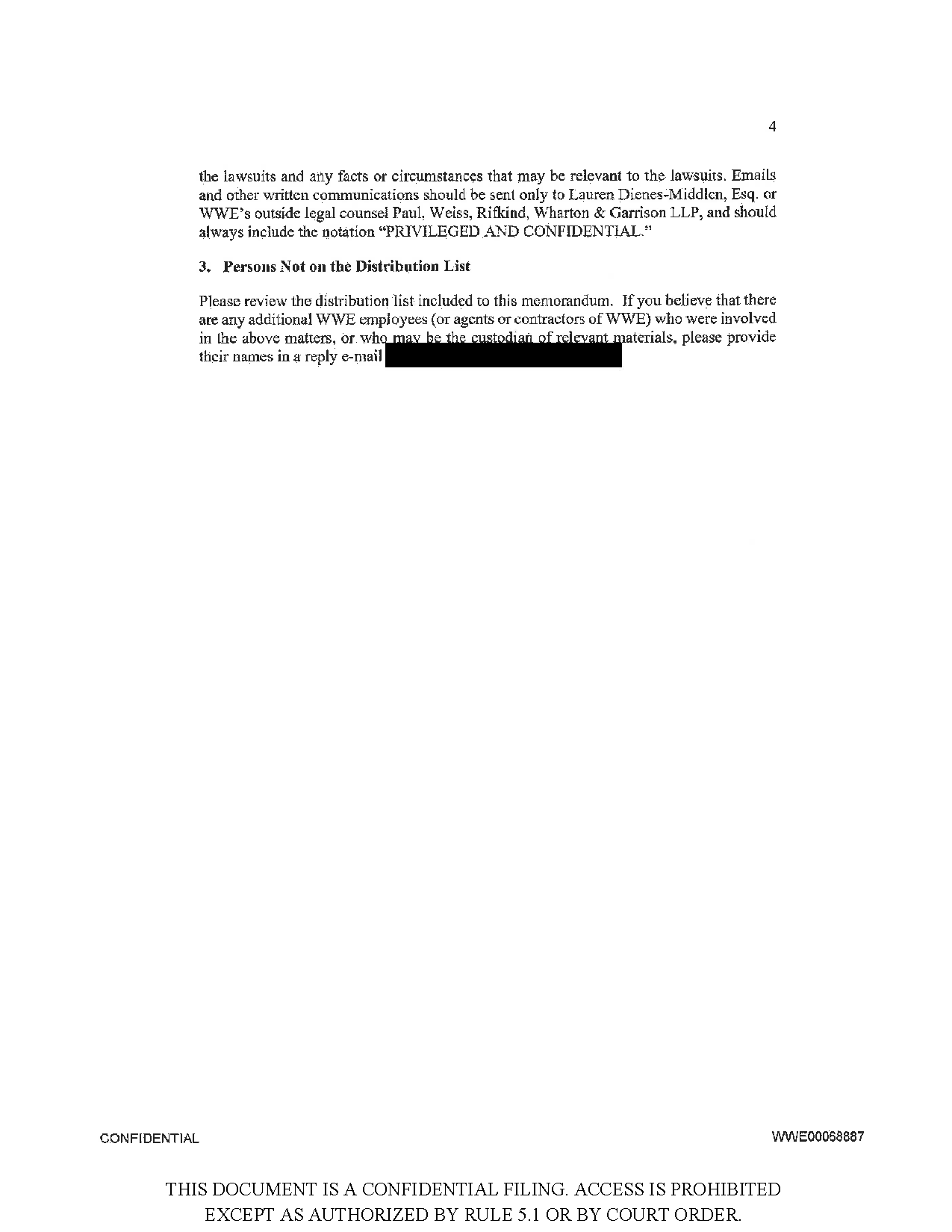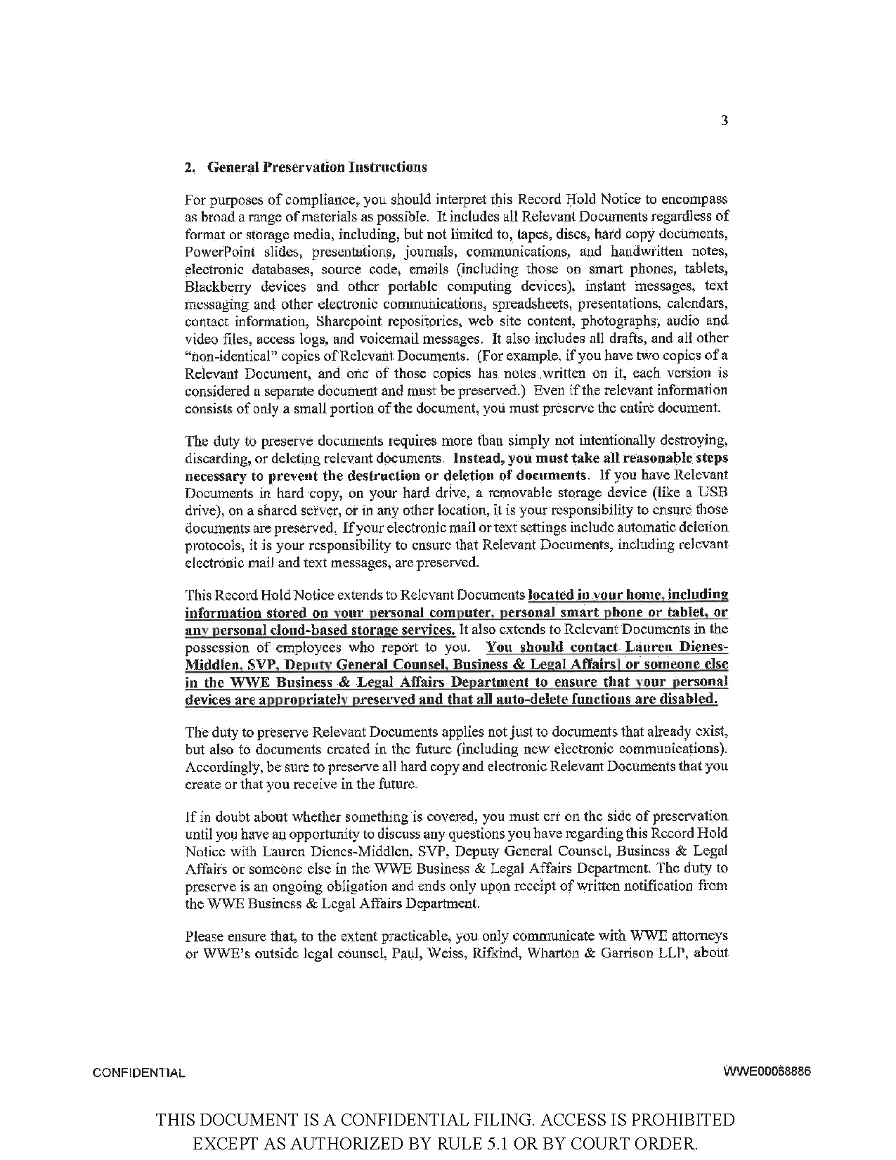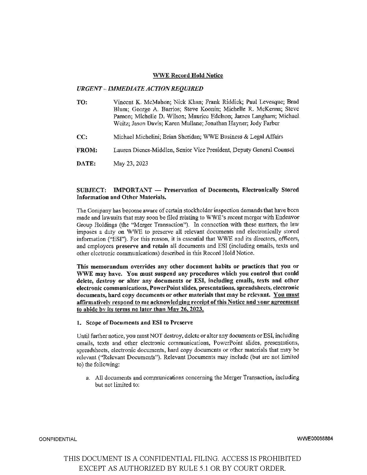 Above: “WWE Record Hold Notice” document, dated May 23, 2023, one of three such notices during the time period relevant to this case, instructing executives and board members to preserve communications. This document is one of many exhibits initially filed under seal and later filed publicly.