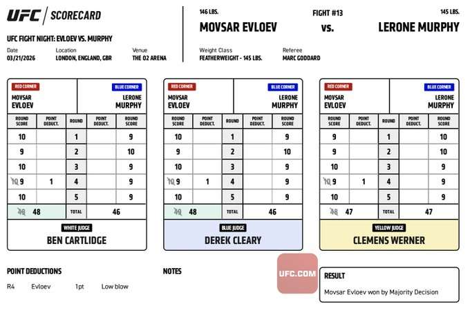 Instead, it was Evloev earning a majority decision from judges Ben Cartlidge, Derek Cleark, and Clemens Warner. The first two scored the fight 48-46 for Evloev, and Warner had it a draw at 47-47.