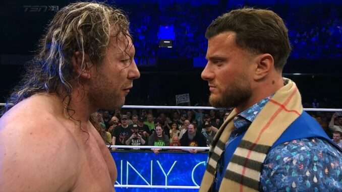 After MJF got all of his catchphrases out, he was interrupted by his next challenger, Kenny Omega. Still in his ring attire, Omega came to the ring and went face-to-face with MJF. “Can I help you?” MJF asked.