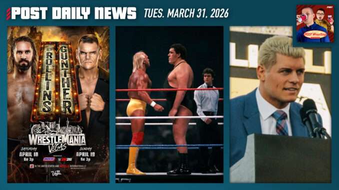 John Pollock covers the news from Tuesday, March 31, with Cody Rhodes asked about AEW, Hogan vs. Andre match to be honored, and the latest ‘Mania 42 news.
