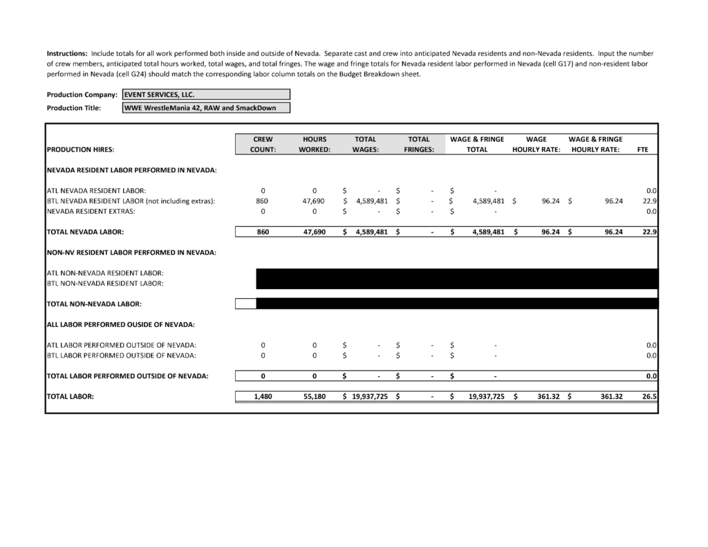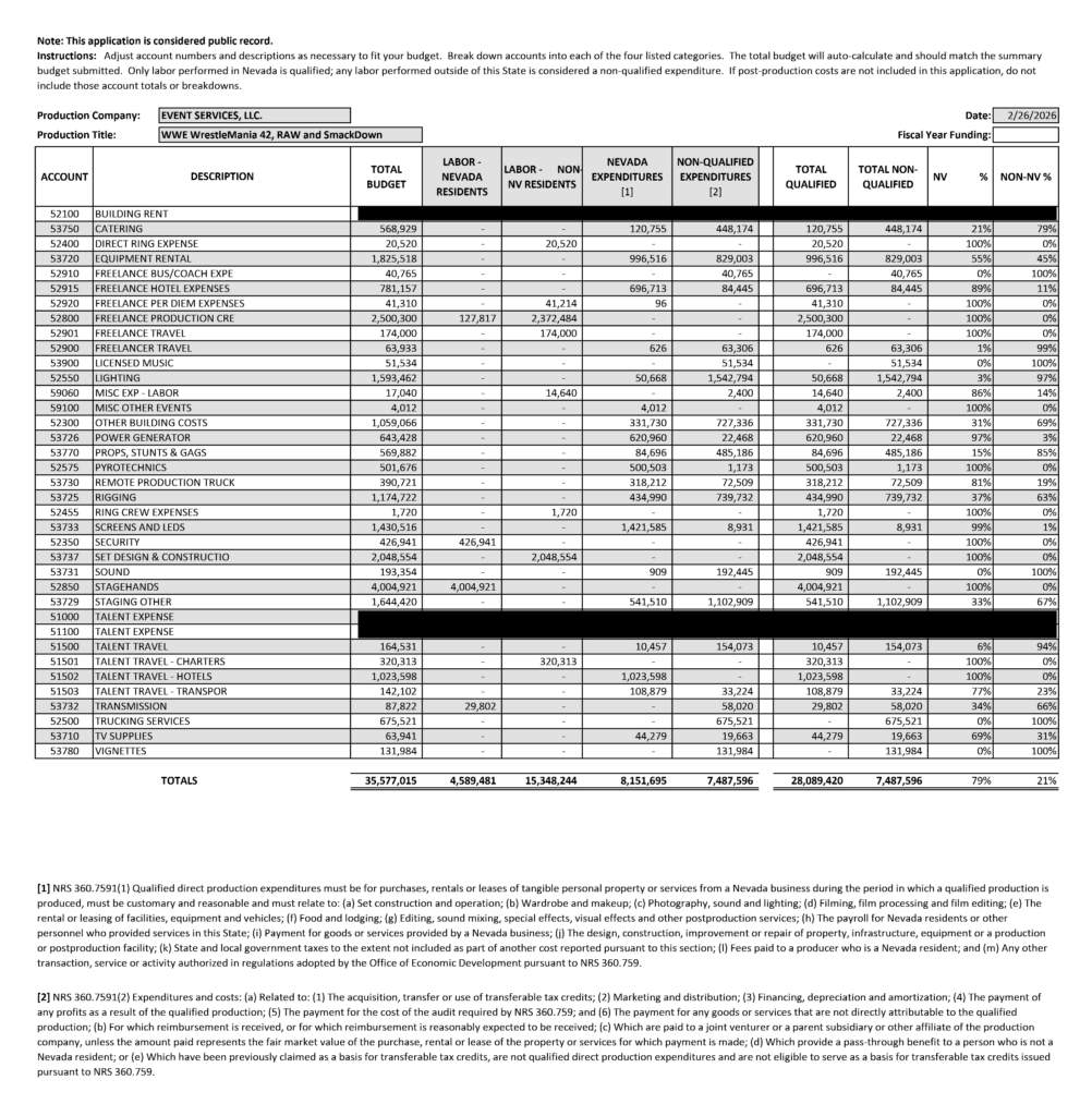 WWE’s budget and tax credit application. Public record via Nevada Governor’s Office of Economic Development.
