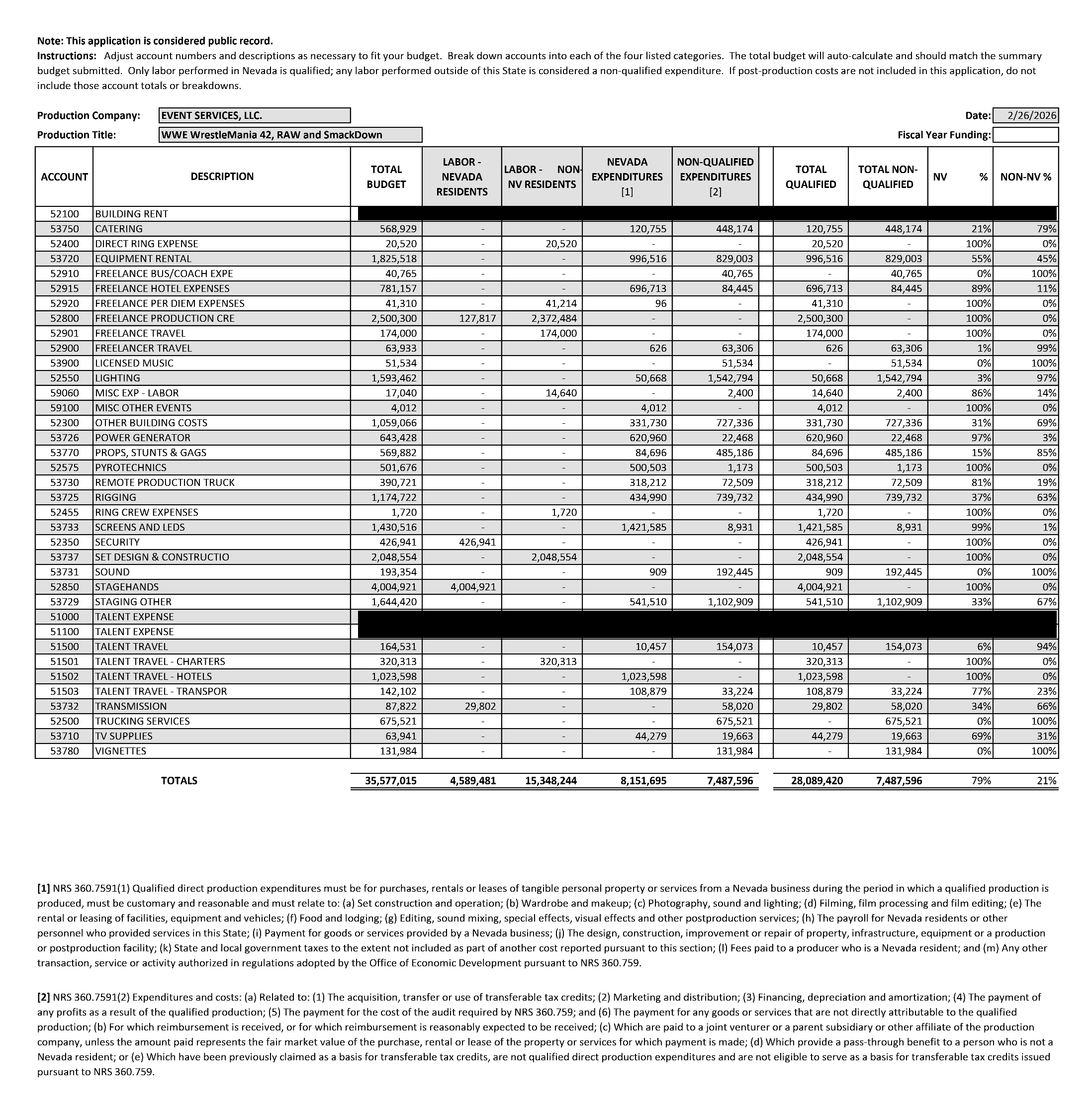 WWE’s budget and tax credit application. Public record via Nevada Governor’s Office of Economic Development.