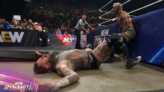The next match saw Christian Cage and Adam Copeland taking on Trent Beretta and Rocky Romero, with FTR and Stokely at ringside. It was noted that this was the first time Cage and Copeland had ever teamed on Dynamite, as they controlled the early part of the match. As expected, Dax and Cash got involved, distracting Christian. The Conglomeration then appeared at ringside, hitting Stokely with a popcorn bucket and then brawling them to the back.