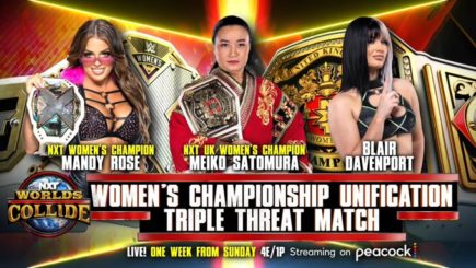 NEWS Triple Threat unification match for NXT and NXT UK Women’s Titles added to Worlds Collide August 23, 2022 Andrew Thompson NXT Women’s Champion Mandy Rose, NXT UK Women’s Champion Meiko Satomura and Blair Davenport to compete for the belts at Worlds Collide