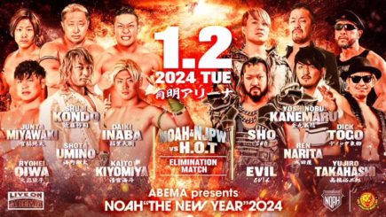 NEWS Elimination tag match added to Pro Wrestling NOAH ‘The New Year 2024’ December 21, 2023 Andrew Thompson The six versus six bout is being branded as NOAH and NJPW versus HOUSE OF TORTURE.
